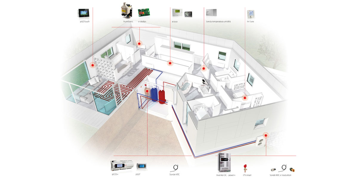 pCO sistema+ allows management of variable speed compressors with DC inverters that, when combined with electronic expansion valves, ensure the most extensive modulation of heating and cooling capacity currently available, maximising residential air-conditioning system efficiency in response to different comfort requirements and different climatic conditions throughout the year. Continuous evolution of the pCO series programmable controllers, the heart of the system, guarantees performance is always in line with new needs.