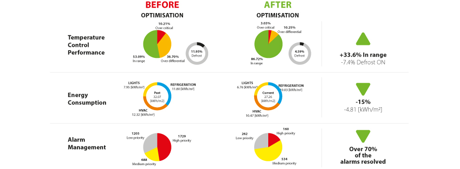 The CAREL optimisation service uses the data collected by the platform to implement and measure optimisation actions that bring tangible benefits in terms of:
